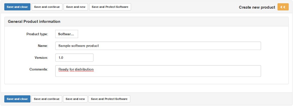 Note: The screenshot above shows the product creation for a company that does not have ESD (electronic software distribution) enabled. If ESD is enabled, additional information has be specified.